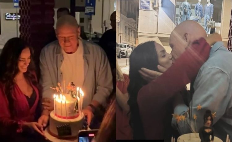 Την ώρα που ο Τζώνη Καλημέρης της πηγαίνει την τούρτα, την πλησίασε και οι δυο τους αντάλλαξαν ένα «καυτό» φιλί στο στόμα.