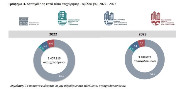 Αυξανόμενη είναι η συμμετοχή των επιχειρηματικών ομίλων, ιδίως των ελληνικών πολυεθνικώς, στην απασχόληση. Ενώ οι ανεξάρτητες επιχειρήσεις, στην πλειονότητά τους μικρές και πολύ μικρές, εξακολουθούν να είναι ο μεγαλύτερος συλλογικός εργοδότης της χώρας, το ποσοστιαίο μερίδιό τους στην απασχόληση υποχωρεί, προς όφελος των πολυεθνικών.