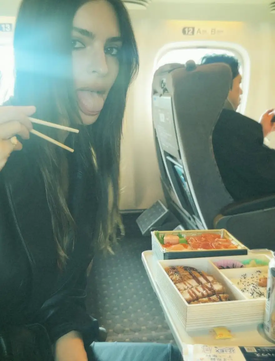 Σε άλλα στιγμιότυπα το μοντέλο παρουσιάζεται στο αεροπλάνο είτε τη στιγμή που απολαμβάνει τα γεύματά της. Σε ένα από τα κλικ φαίνεται, μάλιστα, να καπνίζει πουρό.