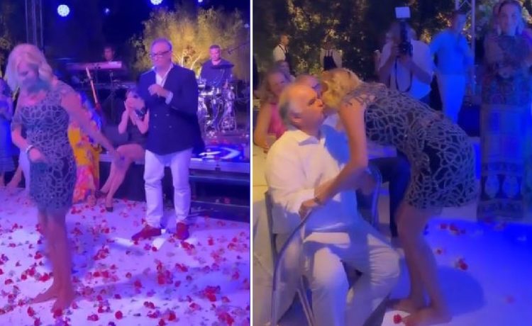 Στη συνέχεια, κατευθύνθηκε στο πρώτο τραπέζι, όπου καθόταν ο σύντροφός της και εφοπλιστής και το ζευγάρι αντάλλαξε ένα φιλί στο στόμα.