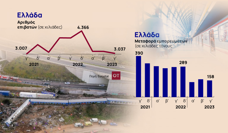 Τα στοιχεία της Eurostat είναι και πάλι αποκαλυπτικά. Το τρίτο τρίμηνο του 2023 για το οποίο υπάρχουν τα πιο τελευταία στοιχεία, μεταφέρθηκαν από τα τρένα στην Ελλάδα 158.000 τόνοι εμπορευμάτων, από 169.000 τόνους το δεύτερο τρίμηνο του ίδιου έτους και 142.000 τόνους το πρώτο τρίμηνο, όταν έγινε και η τραγωδία στα Τέμπη για την οποία αναζητούνται τώρα ευθύνες.
