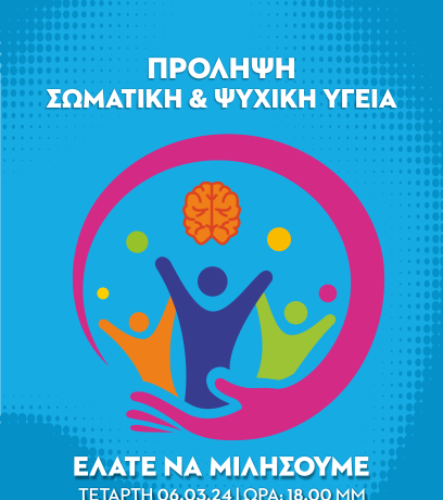 Με θέμα «Πρόληψη: Σωματική και Ψυχική Υγεία», ενημερωτική δράση διοργανώνει αύριο, Τετάρτη 6 Μαρτίου στις 6 το απόγευμα στην αίθουσα εκδηλώσεων του Γυμνασίου Αμπελώνα, το Δίκτυο Πρόληψης και Προαγωγής της Ψυχοκοινωνικής Υγείας.