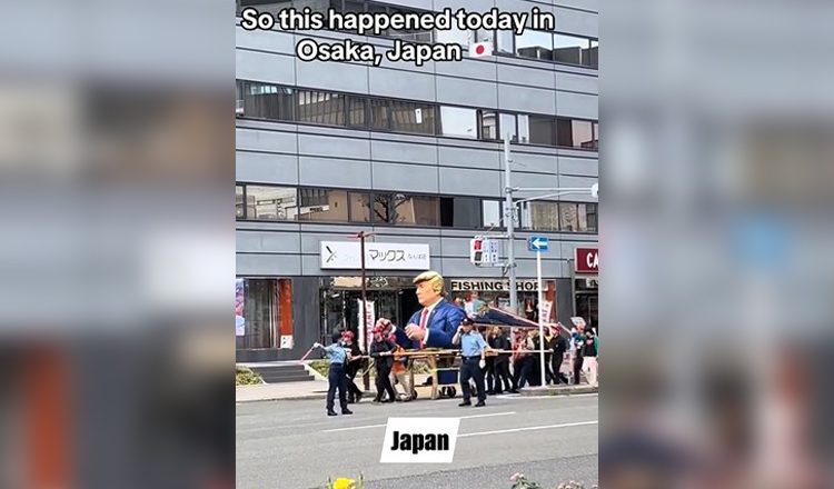 Εκατοντάδες Ιάπωνες, με κόκκινα καπέλα, συναντήθηκαν στους δρόμους της Οσάκα, προκειμένου να μεταφέρουν ένα γιγαντιαίο φορητό ιερό, που απεικόνιζε τον Ντόναλντ Τραμπ με μάτια που αστράφτουν.