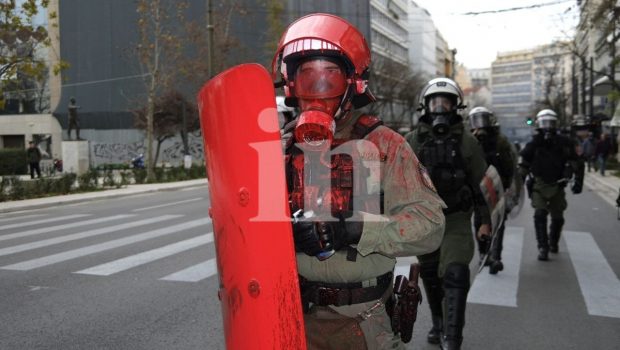 Γεμάτος με χρώμα βρέθηκε ένας αστυνομικός των ΜΑΤ κατά τη διάρκεια των επεισοδίων που σημειώνονται στο κέντρο της Αθήνας, μετά τις μεγαλειώδεις απεργιακές πορείες για το δυστύχημα των Τεμπών.