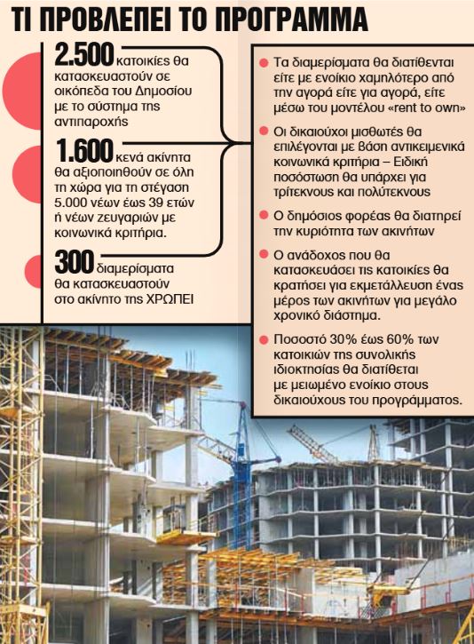 Τα διαμερίσματα θα διατίθενται είτε με «κοινωνικό» ενοίκιο – χαμηλότερο από ό,τι στην αγορά –, είτε για αγορά, είτε μέσω του μοντέλου «rent to own» (ενοικίαση με δυνατότητα εξαγοράς).