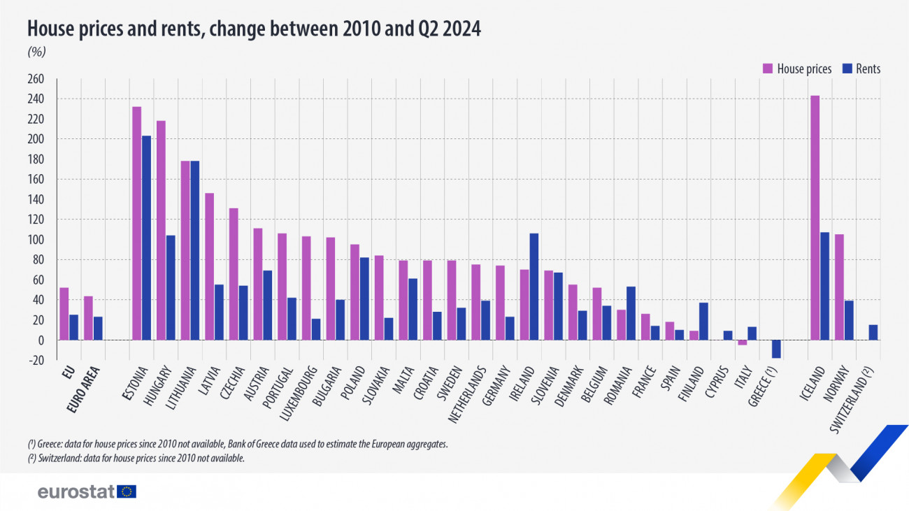 Συγκρίνοντας το δεύτερο τρίμηνο του 2024 με το 2010, μεταξύ των χωρών της ΕΕ για τις οποίες υπάρχουν διαθέσιμα στοιχεία, οι τιμές των κατοικιών αυξήθηκαν περισσότερο από τα ενοίκια σε 20 χώρες. Οι τιμές των κατοικιών υπερτριπλασιάστηκαν στην Εσθονία (+232%) και στην Ουγγαρία (+218%) και έχουν υπερδιπλασιαστεί στη Λιθουανία (+178%), τη Λετονία (+146%), την Τσεχία (+131%), την Αυστρία (+111%) %), Πορτογαλία (+106%), Λουξεμβούργο (+103%) και Βουλγαρία (+102%). Οι τιμές των κατοικιών δεν άλλαξαν στην Κύπρο και μειώθηκαν στην Ιταλία (-5%).