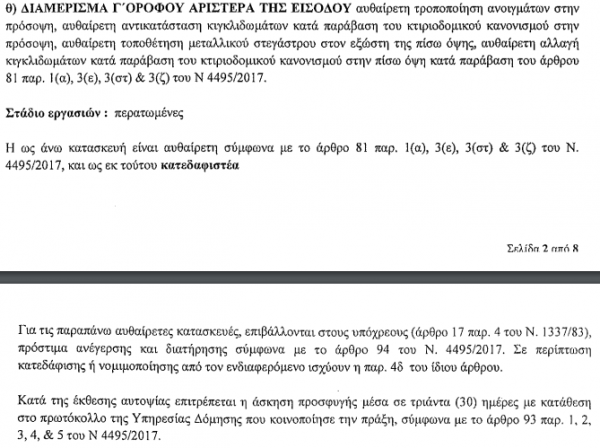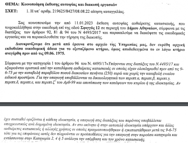 Σε άλλο έγγραφο της Πολεοδομίας με τον ίδιο αριθμό πρωτοκόλλου και ίδια ημερομηνία αναφέρεται ότι «δεν ευρέθη αρχική εκδοθείσα οικοδομική άδεια για το εξεταζόμενο κτήριο, όμως αποδεδειγμένα το εν λόγω κτήριο ανεγέρθη πριν από τις 09.06.1975», συνεπώς υπάγεται «στις διατάξεις του Ν.4495/17» και εξαιρείται οριστικά από την κατεδάφιση