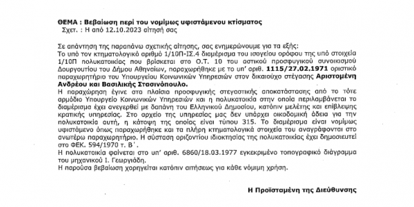 Το έγγραφο της Περιφέρειας Αττικής με αριθμό πρωτοκόλλου 1249522 και ημερομηνία 13/10/2023 βεβαιώνει ότι η πολυκατοικία επί της οδού Σφιγγός 10-12-14 είναι νόμιμη, παρότι δεν διαθέτει οικοδομική άδεια, και εξηγεί τους λόγους. Η ενδιαφερόμενη, κυρία Στασινοπούλου, την προσκομίζει στην Πολεοδομία, για να πάρει την απάντηση: «Σας κοροϊδεύει η Περιφέρεια»…