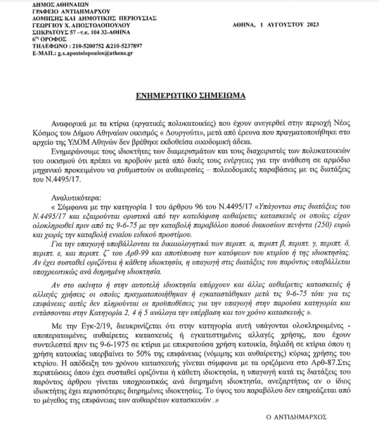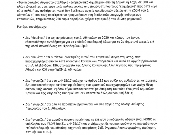 Το ενημερωτικό σημείωμα που στέλνει στους κατοίκους ο τότε αντιδήμαρχος Γεώργιος Αποστολόπουλος, στο οποίο αναφέρεται η λύση που δόθηκε, χωρίς ωστόσο ν’ αντιμετωπίζεται το πρόβλημα καθώς υιοθετεί την προϋπόθεση ύπαρξης οικοδομικής άδειας και εξακολουθεί να θεωρεί αυθαίρετες τις προσφυγικές πολυκατοικίες