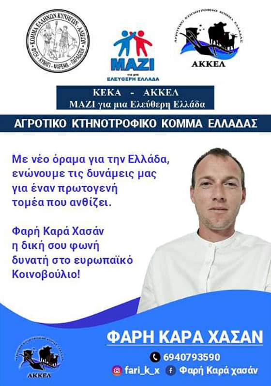 Υποψήφιος με το Αγροτικό Κτηνοτροφικό Κόμμα Ελλάδας θα είναι στις ευρωεκλογές τις 9ης Ιουνίου ο Φαρή Καρά Χασάν.