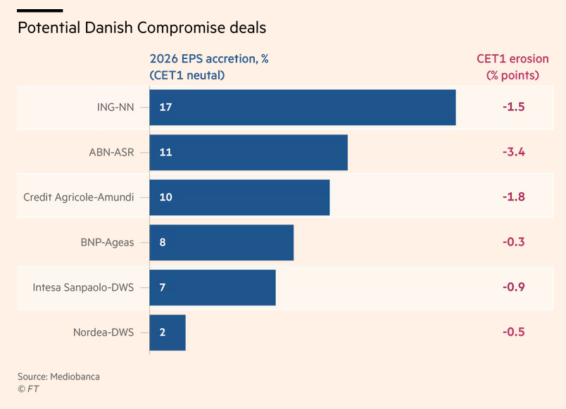 Αυτό το θετικό αποτέλεσμα είναι το αποτέλεσμα μιας παραγνωρισμένης λεπτομέρειας στον Συμβιβασμό της Δανίας, ο οποίος επιτρέπει στις τράπεζες να αγνοούν την υπεραξία στις εξαγορές μέσω ασφαλιστικών μονάδων. Αυτή η λεπτομέρεια ισοδυναμεί ως «εμπλουτισμό πλουτωνίου», σχολιάζει ο Andrea Filtri της Mediobanca, ο οποίος υποστηρίζει ότι θα μπορούσε να απελευθερώσει μια σειρά από νέες συμφωνίες από τις ευρωπαϊκές τράπεζες.
