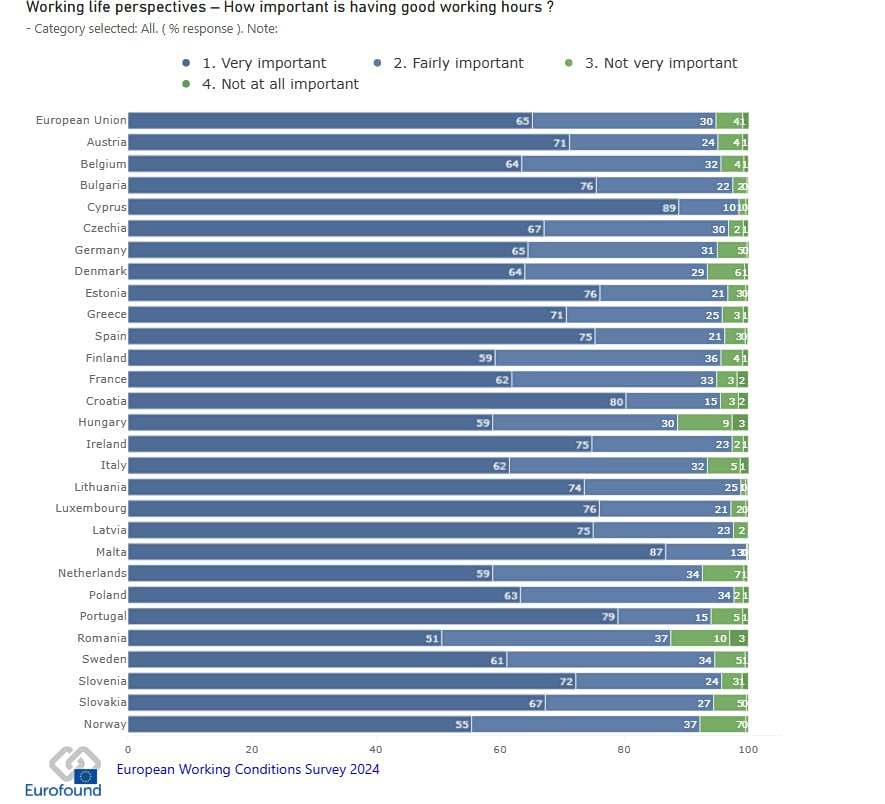 Όπως μπορεί να δει κανείς, συνολικά στην Ευρωπαϊκή Ένωση, κατά μέσο όρο, το 65% θεωρεί πολύ σημαντικό ένα καλό ωράριο εργασίας, το 30% πιστεύει πως είναι σχετικά σημαντικό, ενώ μόνο το 1% απάντησε πως δεν είναι καθόλου σημαντικό.