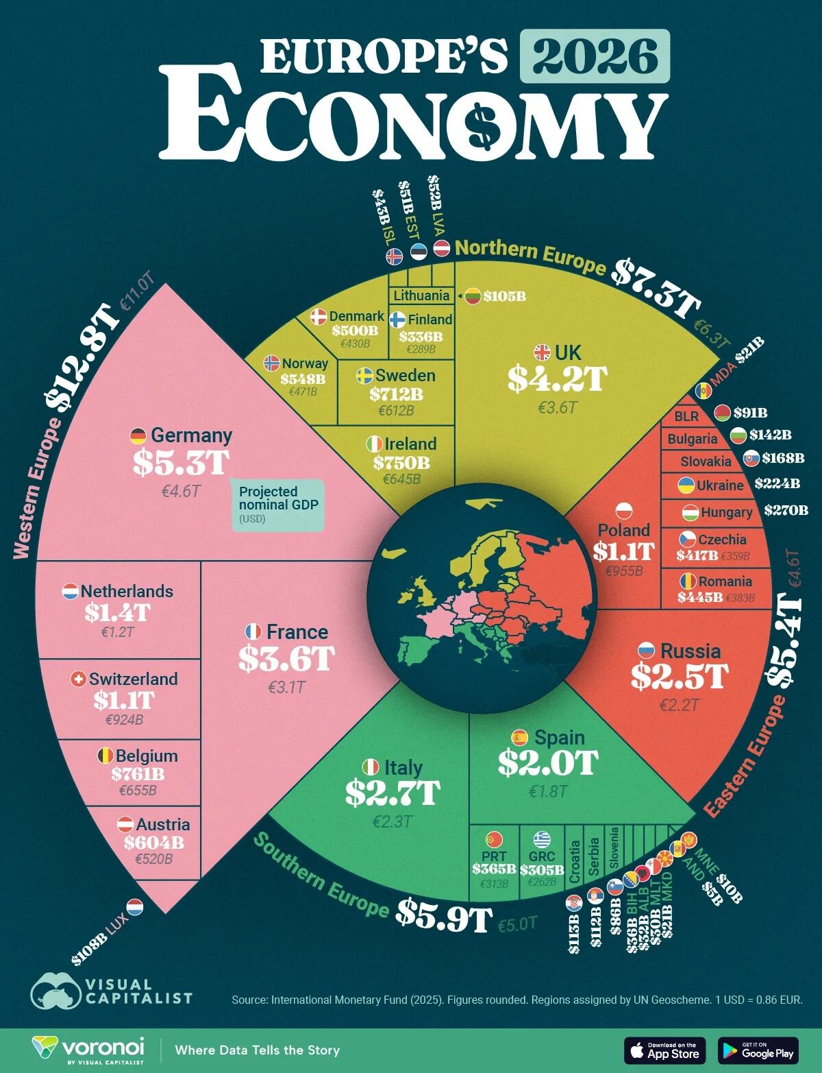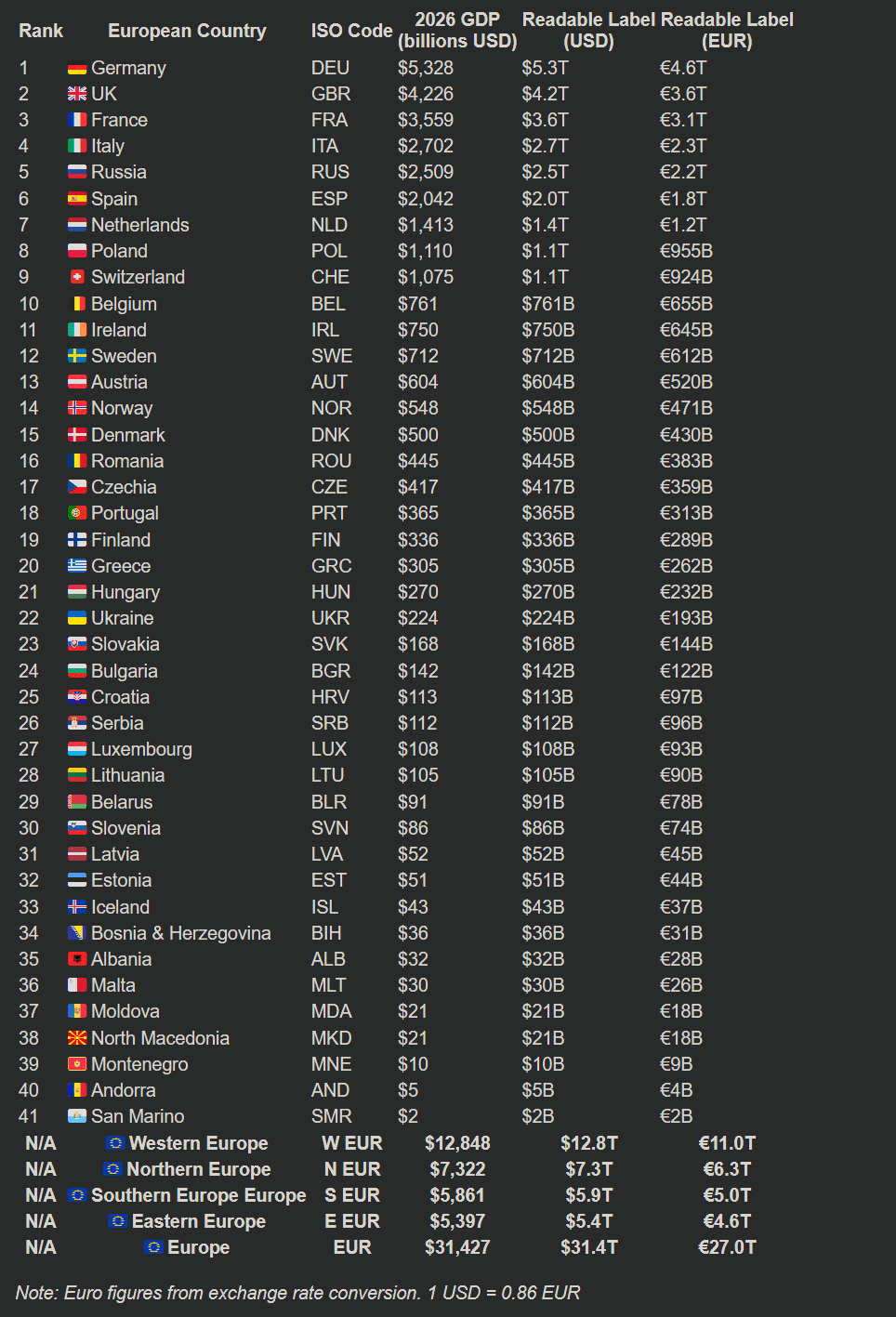 Οι τελευταίες προβλέψεις του Διεθνούς Νομισματικού Ταμείου εκτιμούν ότι το συνολικό ΑΕΠ της Ευρώπης θα φτάσει τα 27,0 τρισεκατομμύρια ευρώ το 2026