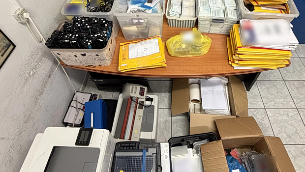 - πλήρως εξοπλισμένο εργαστήριο κατάρτισης πλαστών εγγράφων αποτελούμενο από εκτυπωτές, πλαστικοποιητές, φορητούς υπολογιστές, μηχάνημα laser, μηχάνημα εντύπωσης σφραγίδων κ.α.,