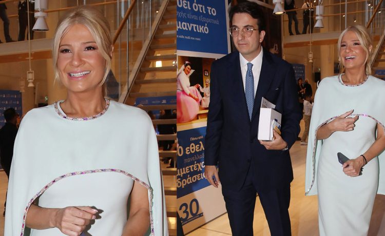 Η Φαίη Σκορδά εμφανίστηκε με ένα εντυπωσιακό μάξι σιέλ φόρεμα που αναδείκνυε την καλλίγραμμη σιλουέτα της, ενώ ο σύντροφός της επέλεξε ένα κομψό μπλε κοστούμι.
