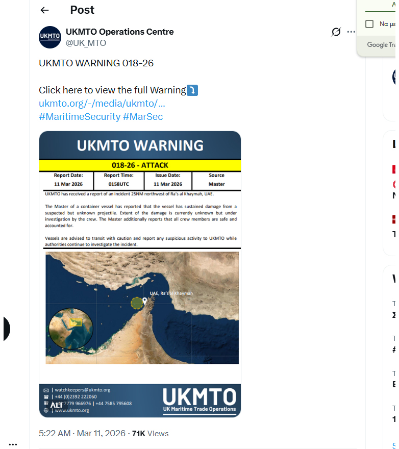 Η ανακοίνωση της UKMTO