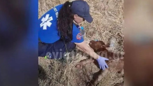 Εθελοντές της Ομάδας Έρευνας και Διάσωσης Εύβοιας, που επιχειρούσαν στο πύρινο μέτωπο, εντόπισαν ένα νεογέννητο μοσχαράκι, το οποίο κείτονταν εξαντλημένο και αφυδατωμένο στο έδαφος, αβοήθητο μέσα σε ένα απανθρακωμένο τοπίο.