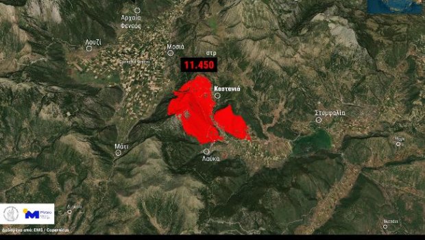 Σύμφωνα με την ανάλυση των δορυφορικών δεδομένων του ευρωπαϊκού μηχανισμού Copernicus EMS, έως και τις 12:23 της Τρίτης είχαν καεί περίπου 11.450 στρέμματα δασικών και χορτολιβαδικών εκτάσεων στις περιοχές μεταξύ Καστανιάς, Λάυκας, Μοσιάς και Οροπεδίου Φενεού.