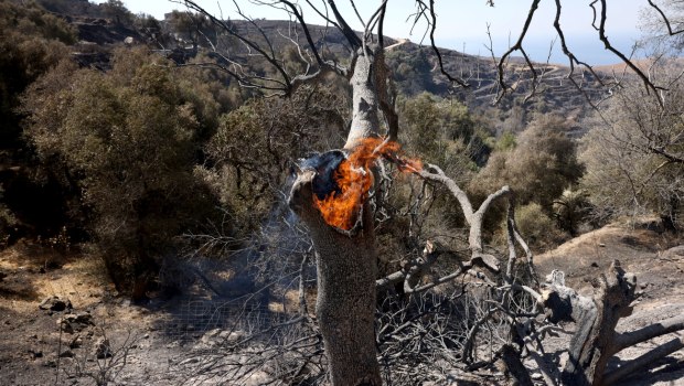 Σημειώνεται ότι η φωτιά στα υψηλότερα σημεία έχει κάψει εκτάσεις με πεύκα και έλατα και στα χαμηλότερα σημεία πουρνάρια.