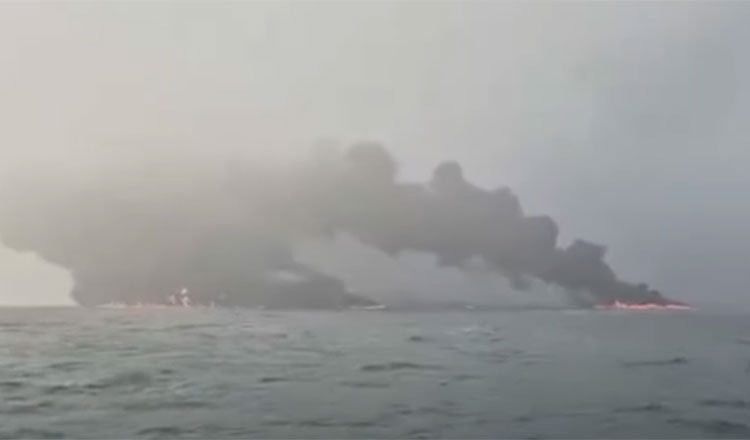 Το πετρελαιοφόρο, που μετέφερε χημικά, συνεχίζει να φλέγεται λόγω της σύγκρουσης με φορτηγό πλοίο στη Βόρεια Θάλασσα. Η φωτιά είναι ορατή και πυκνός μαύρος καπνός αναδύεται, ενώ πάνω στην επιφάνεια της θάλασσας φαίνονται φλόγες από τη διαρροή του υλικού, καθώς προκλήθηκε ρωγμή στο βυτίο.