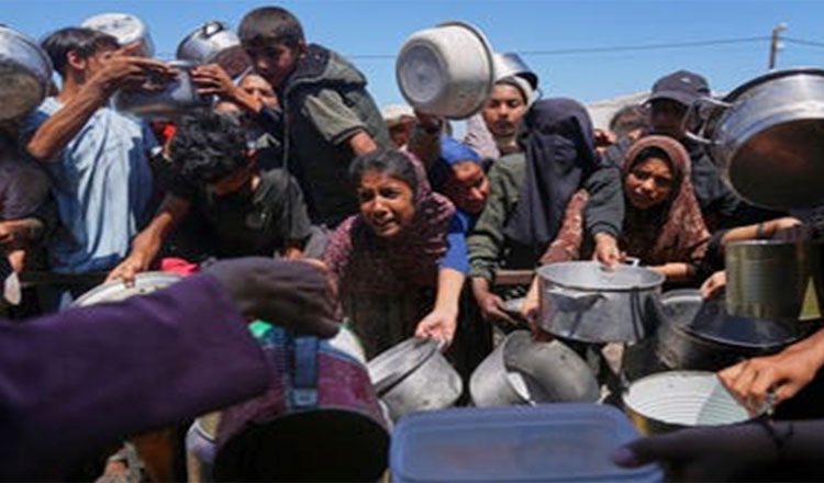 Παλαιστίνιοι αγωνίζονται να πάρουν φαγητό που διανέμεται σε μια κοινοτική κουζίνα στην περιοχή Muwasi του Khan Younis, στη Λωρίδα της Γάζας, Παρασκευή 23 Μαΐου 2025. (AP Photo/Abdel Kareem Hana) Πίστωση: Abdel Kareem Hana/AP