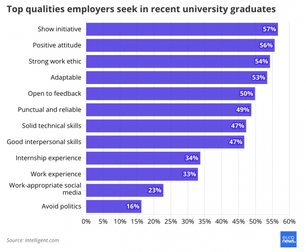Για να βελτιώσουν τις πιθανότητες πρόσληψής τους, οι εργοδότες τόνισαν ότι μερικά από τα κορυφαία προσόντα που αναζητούν είναι η πρωτοβουλία και η θετική στάση.