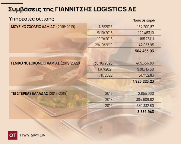 Σύμφωνα με την «Διαύγεια», συμβάλλεται ήδη από το 2016 με υπηρεσίες και οργανισμούς του δημοσίου και συγκεκριμένα με το Δήμο Λαμιέων που εμπιστεύεται τη σίτιση των μαθητών του Μουσικού Σχολείου Λαμίας στην Γιαννίτσης Logistics A.Ε.
