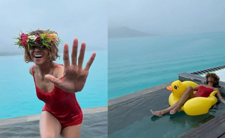 Η Halle Berry φόρεσε στο κεφάλι της ένα στεφάνι με λουλούδια και πόζαρε στην πισίνα με ένα κατακόκκινο, ολόσωμο μαγιό, πάνω σε ένα φουσκωτό στρώμα σε σχήμα πάπιας.