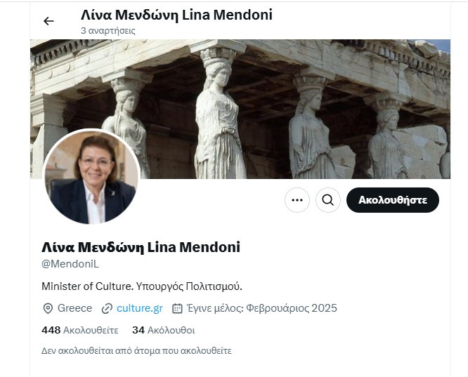 Ακολούθως υπογραμμίζεται πως «η υπουργός Πολιτισμού Λίνα Μενδώνη δεν διαθέτει προσωπικό λογαριασμό σε καμία πλατφόρμα social media. Ως εκ τούτου, λογαριασμός που φαίνεται στο «X» με το όνομα «Λίνα Μενδώνη Lina Mendoni»(@MendoniL) δεν αντιστοιχεί σε πραγματικό προφίλ της υπουργού Πολιτισμού».