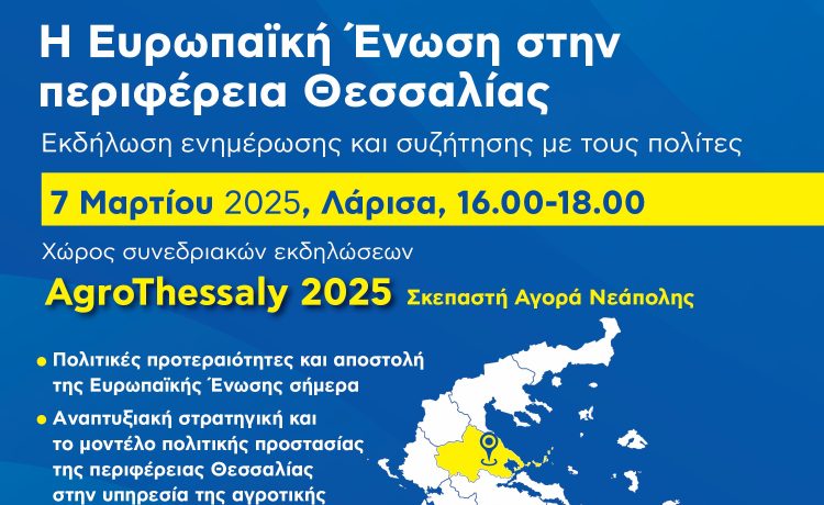 Εκδήλωση ενημέρωσης και συζήτησης με τους πολίτες, χώρος συνεδριακών εκδηλώσεων AgroThessaly 2025, Σκεπαστή Αγορά Νεάπολης, Λάρισα. Θέμα «Η Ευρωπαϊκή Ένωση στην Περιφέρεια Θεσσαλίας», στον ειδικά διαμορφωμένο χώρο συνεδριακών εκδηλώσεων στη Σκεπαστή Αγορά Νεάπολης στη Λάρισα.