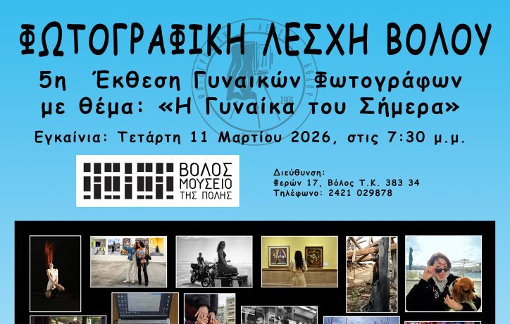 Την 5η Έκθεση γυναικών-φωτογράφων από τη Μαγνησία με θέμα «Η Γυναίκα του Σήμερα» παρουσιάζει η Φωτογραφική Λέσχη Βόλου στο Μουσείο της Πόλης του Βόλου στον Βόλος (Φερών 17, Παλαιά), από τις 11 έως τις 29 Μαρτίου 2026.