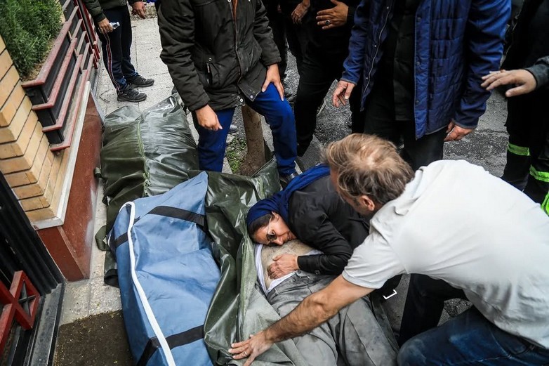 Κάτοικοι της γειτονιάς που επλήγη, θρηνούν πάνω από τους δικούς τους ανθρώπους που έχασαν τόσο άδικα τη ζωή τους, σε ένα παράλογο πόλεμο, ενώ προσπαθούν να προσφέρουν τις πρώτες βοήθειες στους υπόλοιπους τραυματίες.