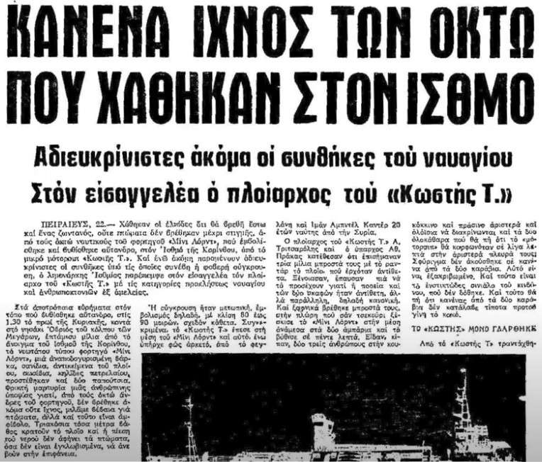 «Παρά την ταχύτατη κινητοποίηση» αναφέρει η εφημερίδα Μακεδονία της εποχής «ξεκίνησαν άμεσα ταχύπλοα σκάφη του λιμενικού, από τα διϋλιστήρια Βαρδινογιάννη έφυγαν όλα τα ρυμουλκά, πλησίασαν όλα τα παραπλέοντα πλοία, ναυαγοσωστικά σκάφη ξεκίνησαν από τον Πειραιά και την Ελευσίνα ενώ πολεμικό αεροπλάνο έριχνε φωτοβολίδες φωτίζοντας την περιοχή του ναυαγίου… όλοι αντίκρυσαν την ίδια εικόνα, ξύλα, πετρελαιοκηλίδες, ατομικά σωσίβια, διάσπαρτα αντικείμενα του πλοίου, την αναποδογυρισμένη σωσσίβια λέμβο αλλά ούτε ίχνος από τους οκτώ άνδρες του πληρώματος…».
