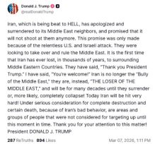 «Το Ιράν, το οποίο έχει υποστεί συντριπτική ήττα, ζήτησε συγγνώμη και παραδόθηκε στους γείτονές του στη Μέση Ανατολή, υποσχόμενο ότι δεν θα τους επιτεθεί ξανά. Αυτή η υπόσχεση δόθηκε μόνο λόγω της αμείλικτης επίθεσης των ΗΠΑ και του Ισραήλ», σημείωσε.