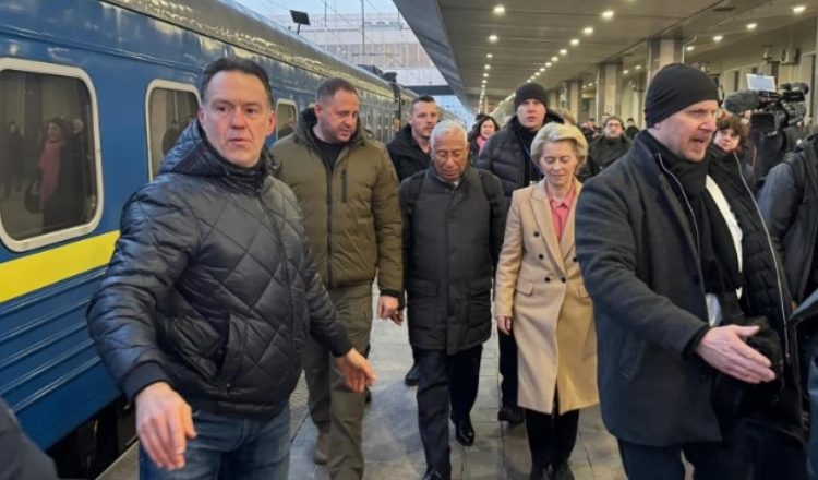 Οι ηγέτες της ΕΕ έφτασαν σήμερα στο Κίεβο για να εκφράσουν την υποστήριξή τους στην Ουκρανία κατά την τρίτη επέτειο από τη ρωσική εισβολή στη χώρα.
