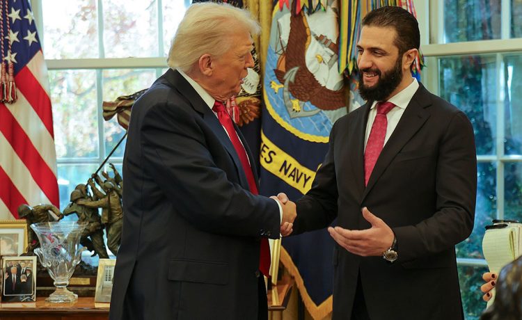 Από τη μαύρη λίστα των καταζητούμενων «τρομοκρατών» του FBI στον Λευκό Οίκο. Ο Ντόναλντ Τραμπ υποδέχθηκε χθες (10/11) τον Σύρο πρόεδρο Άχμεντ αλ Σάρα, κάτι άνευ προηγουμένου για οποιονδήποτε αρχηγό του συριακού κράτους από ιδρύσεώς του, καθαγιάζοντας τον πρώην τζιχαντιστή, η χώρα του οποίου ανακοινώθηκε πως θα ενταχτεί στον διεθνή αντιτζιχαντιστικό συνασπισμό υπό τις ΗΠΑ εναντίον της οργάνωσης Ισλαμικό Κράτος (ΙΚ).