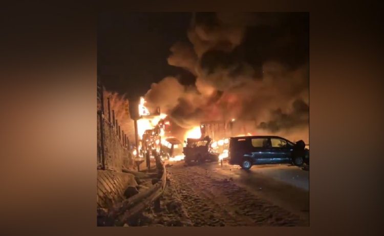 Σε βίντεο που αναρτήθηκαν στα κοινωνικά δίκτυα, φαίνεται μια ισχυρή έκρηξη ακολουθούμενη από πύρινη λαίλαπα να κατακαίει πολυάριθμα οχήματα, ενώ πυκνά μαύρα σύννεφα καπνού στροβιλίζονται στον ουρανό.