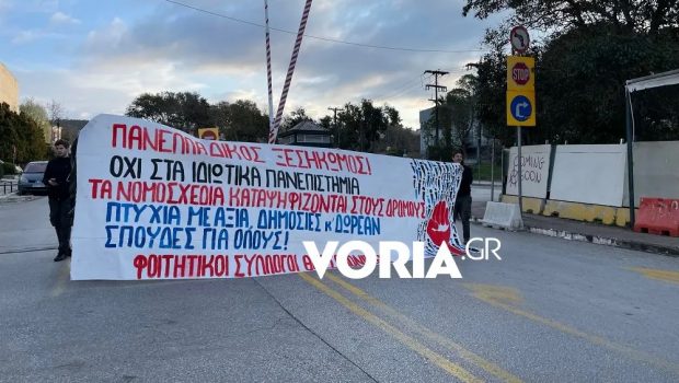 Οι φοιτητές έχουν αναρτήσει πανό στις εισόδους του πανεπιστημίου επί των οδών Εγνατίας και Εθνικής Αμύνης. Ο αποκλεισμός των εισόδων θα διαρκέσει έως και τις 12:00.