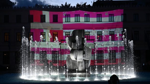Το έργο τέχνης «Ενοχή της Γειτονιάς» (Neighborhood Guilt) της Γεωργίας Λαλέ «έντυσε» το δημαρχείο Αθηναίων στην πλατεία Κοραή, το βράδυ της 8ης Μάρτη, την Ημέρα της Γυναίκας.