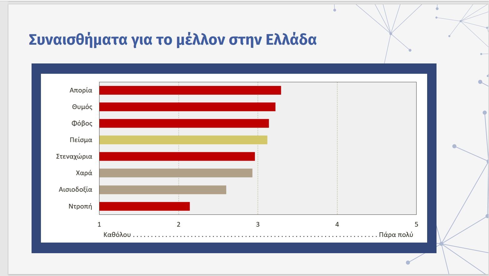 - συνοδεύονται από γενικά αρνητικές κρίσεις, όσον αφορά στις συνθήκες στην ελληνική πραγματικότητα, και από υπεροχή των αρνητικών συναισθημάτων έναντι των θετικών.