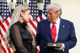 Η Έρικα Κερκ, σύζυγος του δολοφονημένου συντηρητικού ακτιβιστή Τσάρλι Κερκ, ακούει τον πρόεδρο των ΗΠΑ Ντόναλντ Τραμπ κατά τη διάρκεια τελετής απονομής του Προεδρικού Μετάλλιου της Ελευθερίας στον Τσάρλι Κερκ, στο Λευκό Οίκο στην Ουάσινγκτον, στις 14 Οκτωβρίου 2025.