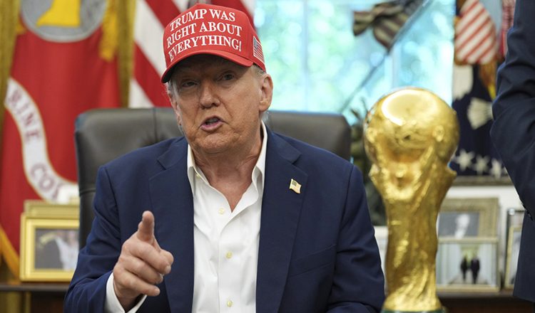 Εμφανίστηκε χαλαρός, χωρίς γραβάτα και φορούσε ένα από τα γνωστά καπέλα της συλλογής του που έγραφε «ο Τραμπ είχε δίκιο για όλα». Έχοντας πλάι του στο Οβάλ Γραφείο τον πρόεδρο της FIFA, Τζιάνι Ινφαντίνο, καθώς και τον αντιπρόεδρο της κυβέρνησής του, Τζέι Ντι Βανς, ανακοίνωσε ότι η κλήρωση του Παγκοσμίου Κυπέλλου που θα συνδιοργανώσουν οι ΗΠΑ με τον Καναδά και το Μεξικό θα γίνει τον Δεκέμβριο στο «Kennedy Center» στην Ουάσιγκτον.