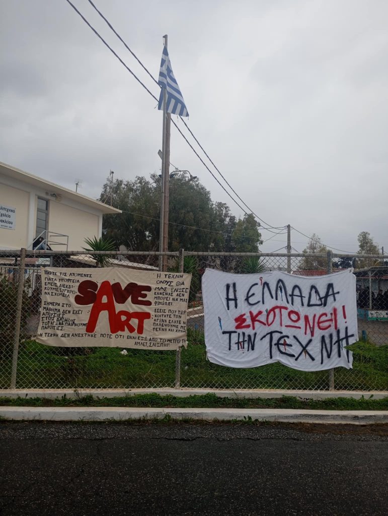 Σε ένα από τα πανό γράφει η «Ελλάδα σκοτώνει την τέχνη», με τους μαθητές, τους εκπαιδευτικούς και τους γονείς να εκφράζουν την αγωνία τους για το μέλλον της καλλιτεχνικής εκπαίδευσης στη χώρα.