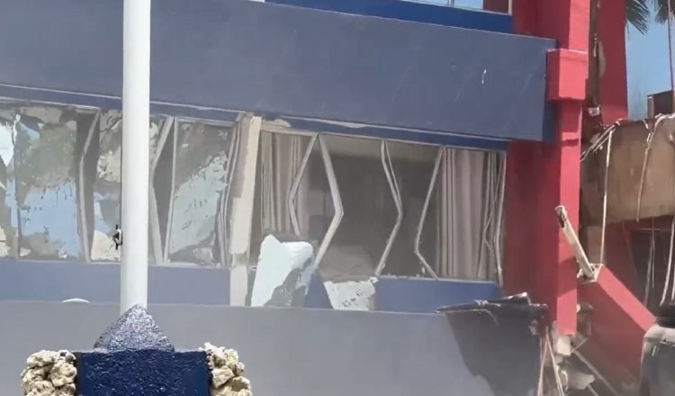 Οπτικό υλικό που μεταφόρτωσε στο διαδίκτυο ο κ. Τόμσον εικονίζει κτίριο όπου βρίσκονταν αρκετές ξένες διπλωματικές αντιπροσωπείες που έχει υποστεί εκτενείς ζημιές — το ισόγειο έχει καταρρεύσει.