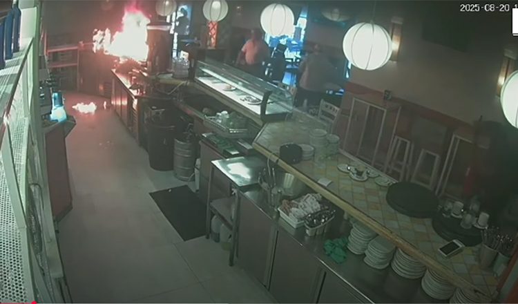 Όπως διακρίνεται και στο βίντεο, ο πάγκος αρπάζει φωτιά, την ώρα που πελάτες και μέλη του προσωπικού απομακρύνονται άμεσα από το σημείο. Αξίζει να σημειωθεί πως οι υπάλληλοι κατάφεραν να σβήσουν τη φωτιά με πυροσβεστήρα, προτού εξαπλωθεί.