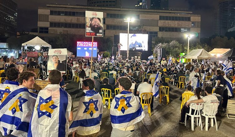 Οι διοργανωτές έχουν τοποθετήσει γιγαντοοθόνες στην πλατεία, όπου αναμένεται να προβληθεί η στιγμή της επιστροφής των ομήρων στο Ισραήλ.