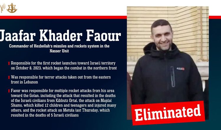 Ο ισραηλινός στρατός ανακοίνωσε το Σάββατο ότι σκότωσε στον νότιο Λίβανο τον Τζααφάρ Χαντέρ Φαούρ, διοικητή της μονάδας Νάσερ, υπεύθυνης για τις συστοιχίες πυραύλων της Χεζμπολάχ.
