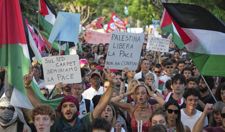 Χιλιάδες διαδήλωσαν το Σάββατο στη Βενετία για να καταγγείλουν τις ενέργειες του Ισραήλ στη Λωρίδα της Γάζας, στο περιθώριο του 82ου Φεστιβάλ Κινηματογράφου της Βενετίας, που φέτος φέρει ιδιαίτερα πολιτικό στίγμα.