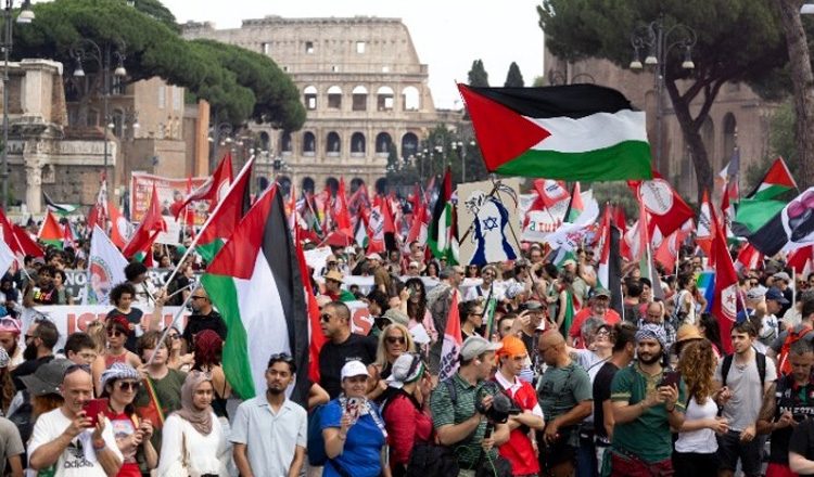 Μέλη και στελέχη των Πέντε Αστέρων, της Ιταλικής Αριστεράς, ιταλικών συνδέσμων και κινημάτων συμμετείχαν, το απόγευμα του Σαββάτου στη Ρώμη σε κινητοποίηση κατά του εξοπλισμού της Ευρώπης και των ισραηλινών βομβαρδισμών στη Γάζα.