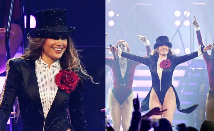 Η Jennifer Lopez εμφανίστηκε στη σκηνή με ένα ασπρόμαυρο λαμπερό κορμάκι σε στυλ κοστουμιού και διχτυωτό καλσόν, στο πλαίσιο του νέου της σόου, το οποίο ξεκίνησε στις 6 Μαρτίου και θα διαρκέσει έως τις 28 του μήνα, σύμφωνα με τη Daily Mail.